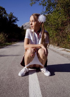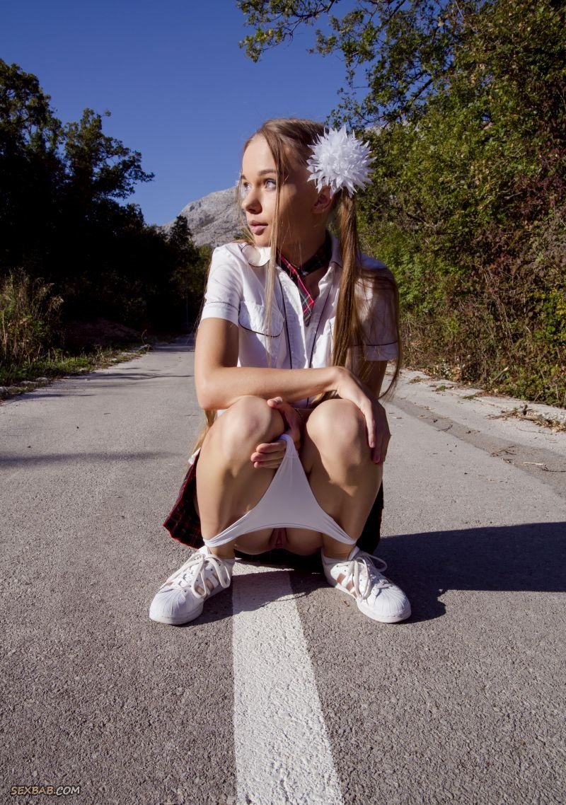Описание: Высоко задрав перед камерой свою короткую юбку и медленно стянув свои белые трусы, молодая шлюшка с выставленной на показ голой промежностью вовсю дрочит бритую пизду прямо на дороге. Энергично меняя позы, худая девица все больше оголяет перед нами свои интимные места и продолжает трахать пальцами мокрую горячую дырку.