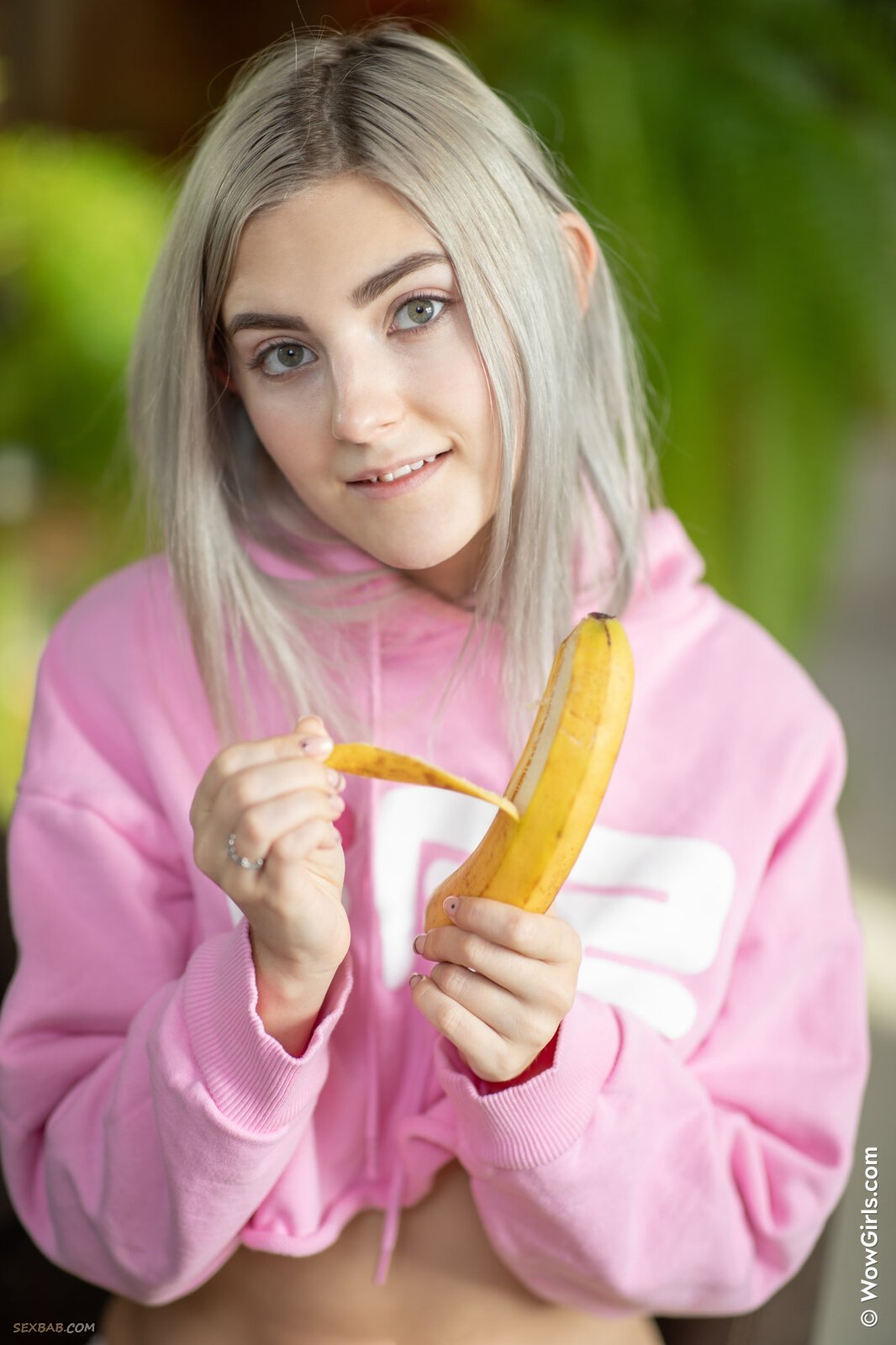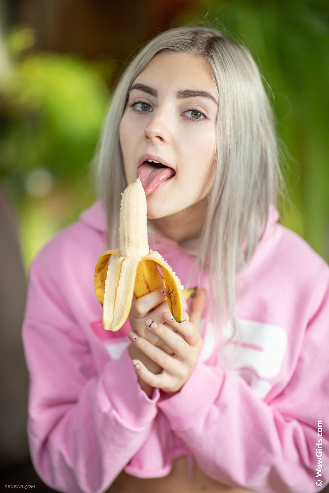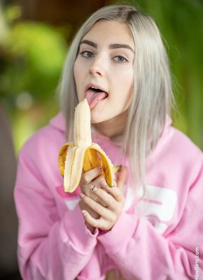 Описание: Аппетитная развратная девица в розовой одежде эротично поедает длинный сочный банан и постепенно оголила перед камерой свои выдающиеся прелести. Чувственно изгибаясь всем телом в кресле, обнаженная блондинка с большими упругими дойками бесстыже показала всем свою гладкую сладкую киску.