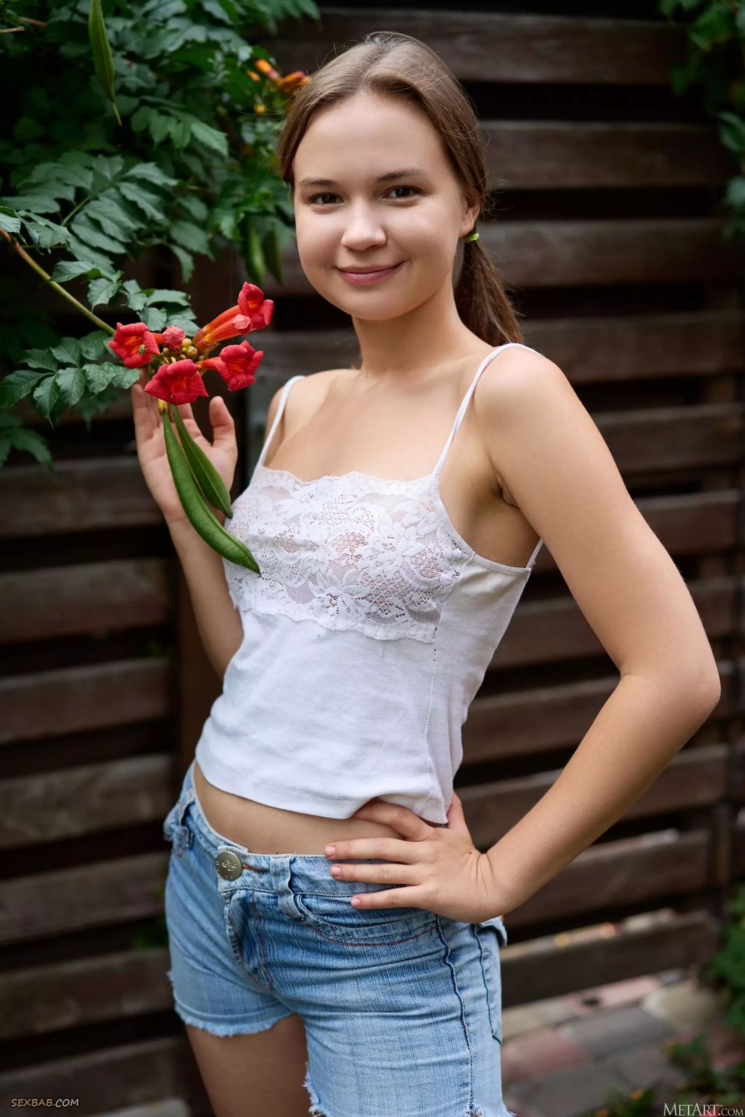 Описание: Кокетливо стянув для начала с себя маечку, энергичная молодая милашка с голыми титьками снимает перед камерой короткие джинсовые шорты. Представ перед нами абсолютно обнаженной, игривая барышня удобно устраивается на стуле с высоко задранными ногами и во всей красе показывает в промежности сочную бритую пизду.