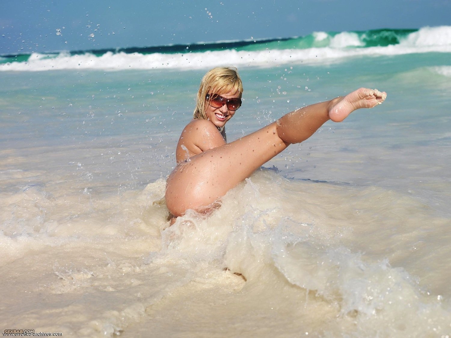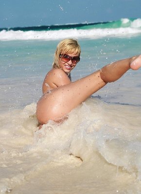 Описание: Наслаждаясь жарким летним днем, грудастая блондинка в очках возбуждающе купается в море и эротично валяется на пляже. Часто прогибаясь раком, сексуальная девушка акцентировала внимание на задницу, а порой раздвигая ноги все же засвечивала бритую письку и гладкий лобок.