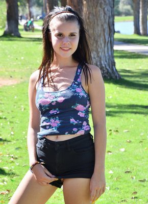 Описание: Симпатичная молодая девушка в коротких шортах и майке, наслаждаясь летним днем, позирует на утренней пробежке. Чередуя в процессе разные необычные ракурсы, сексуальная спортсменка довольно скоро открыла нашему взору свой лифчик, из которого вываливается её аппетитная грудь с красивым сосочком.