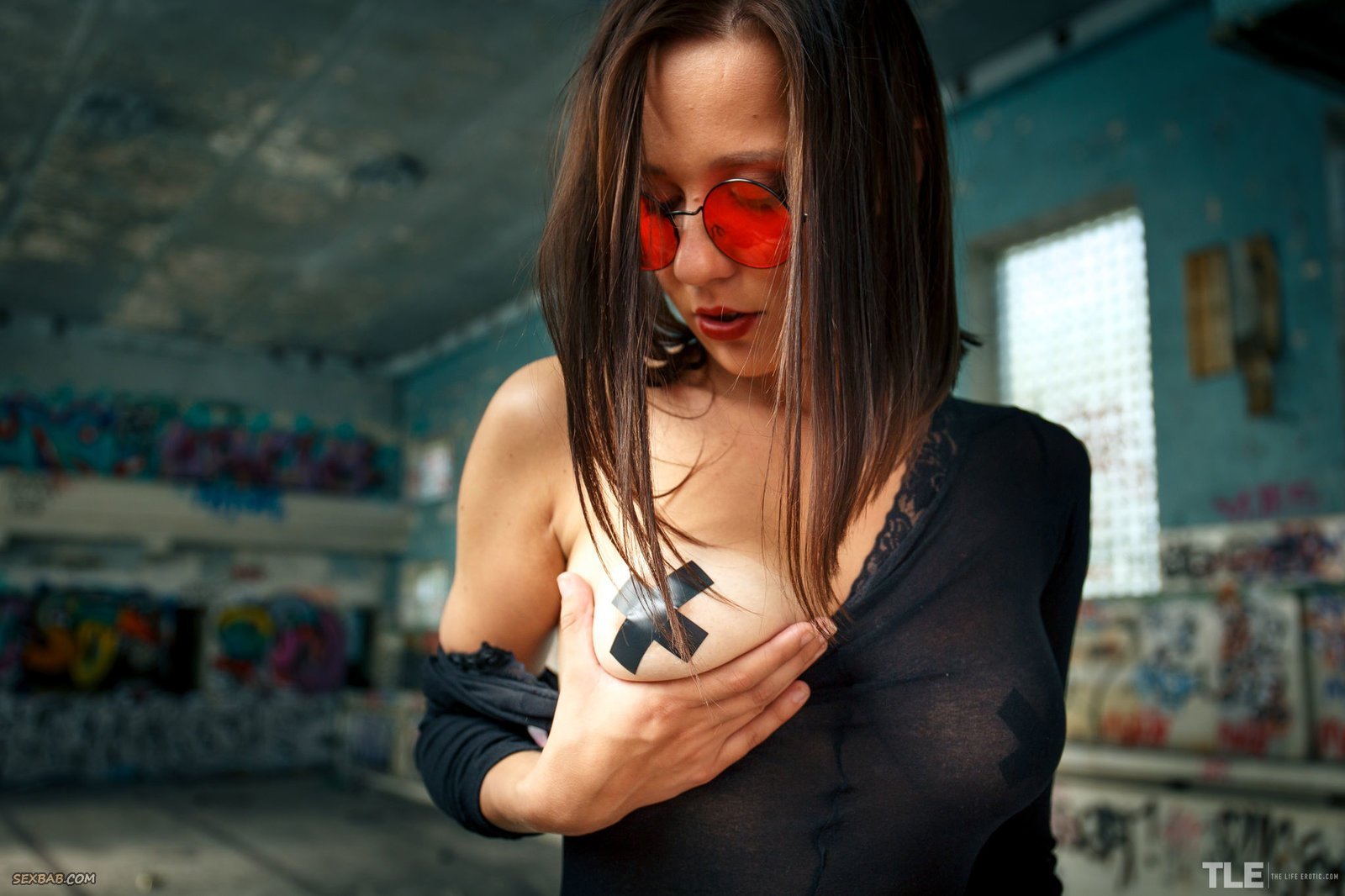 Описание: Нарядившись в возбуждающий капроновый комбинезон с прорезью между ног, дерзкая и невероятно сексуальная модель в красных очках с плеткой позирует в заброшенном здании. Наслаждаясь, красотка с заклеенными сосочками на натуральных сиськах раздвигает промежность, и трогая клитор акцентирует внимание на бритой письке.