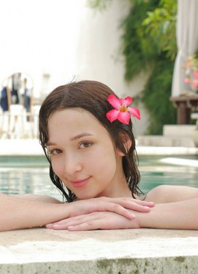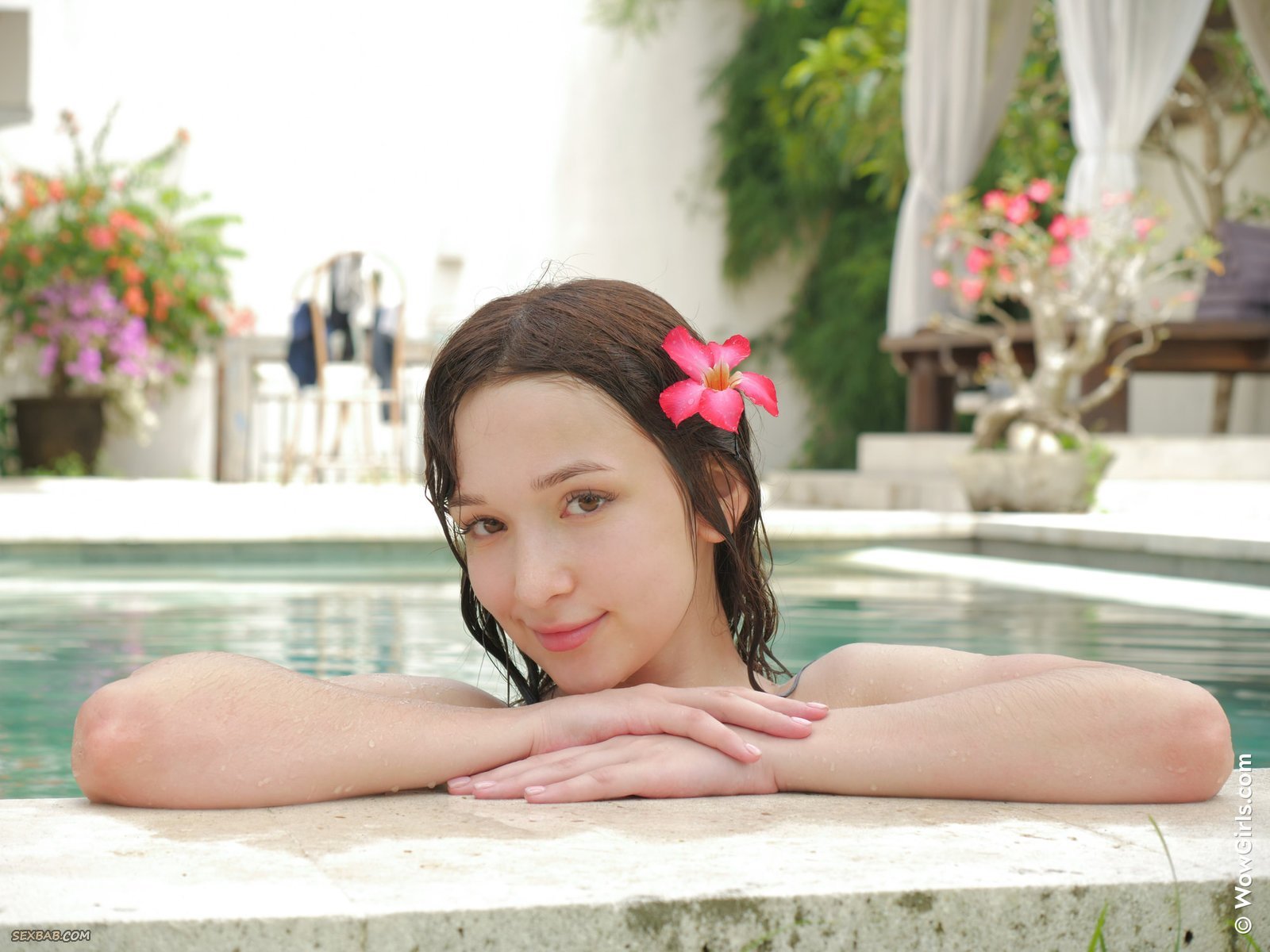 Описание: Устав от душного дома, очаровательная милашка с сочной накачанной попкой решила искупаться в бассейне совершено голой. Молодая брюнетка эротично сняла с себя всю одежду и с удовольствием нырнула в прохладную воду, засветив маленькие титьки и бритую гладкую киску.