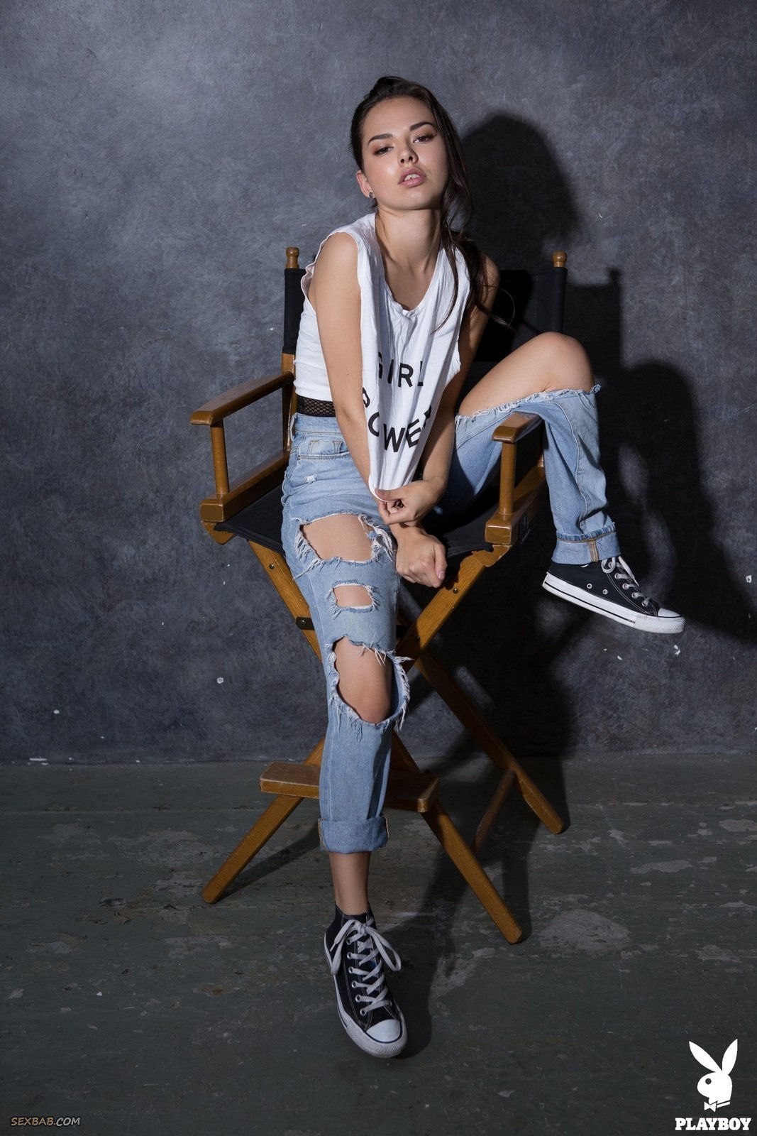Описание: Молодая и невероятно сексуальная красивая модель с худенькой талией начинает эротично позировать в порванных джинсах и полупрозрачном боди. В будущем стройняшка с маленькой грудью медленно раздевается и немного засвечивает упругую попку с гладенькой писькой и лобком.