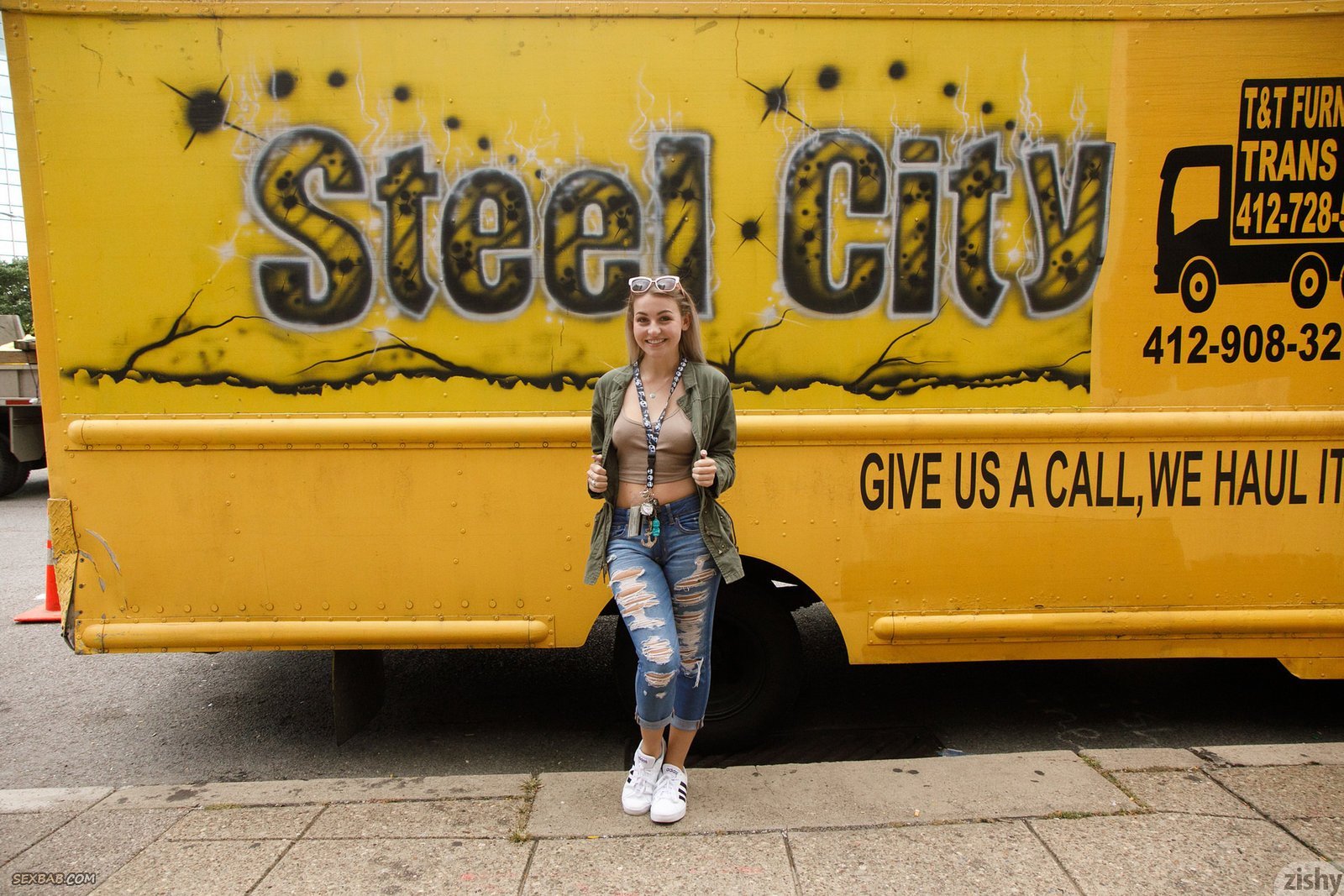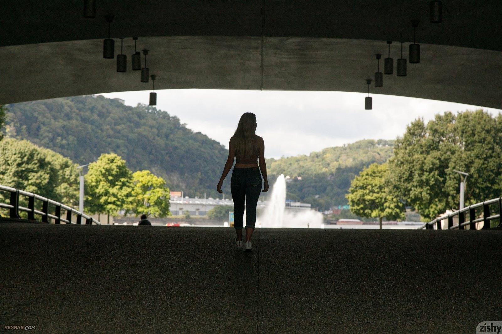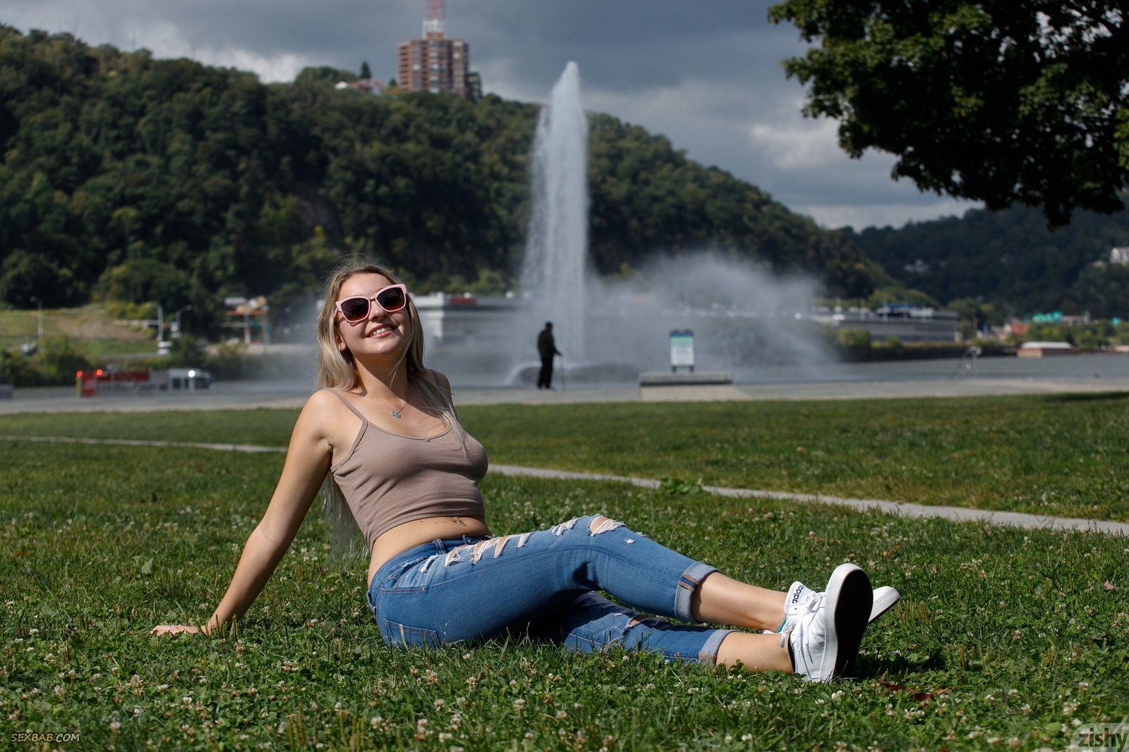 Описание: Выбравшись теплым днем на прогулку по городу, привлекательная девушка в майке, под которым не было лифчика, и джинсах ощущает от процесса желаемое наслаждение. Мило улыбаясь, в некоторые моменты сексуальная блондинка с торчащими сосочками приспускала штаны, и засвечивала трусики.
