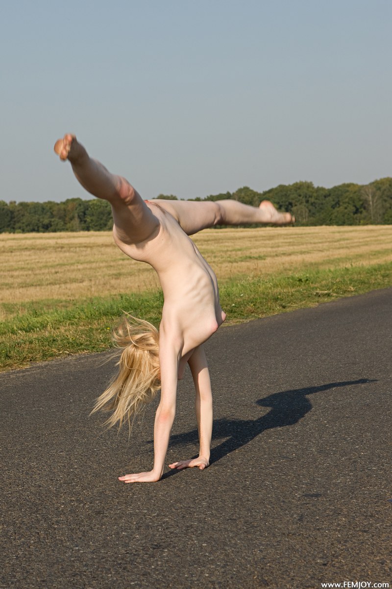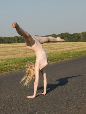 Нет, это не мираж и не сон. Это сексапильная очаровашка, которая босиком и голышом танцует на трассе. Под солнцем переливается ее молочно-белая кожа, на ветру развеваются ее длинные светлые волосы. А ее грудь, писечка и попа вызывающе доступны и видны. Скорее, подбирай свое похотливое счастье к себе в машину!